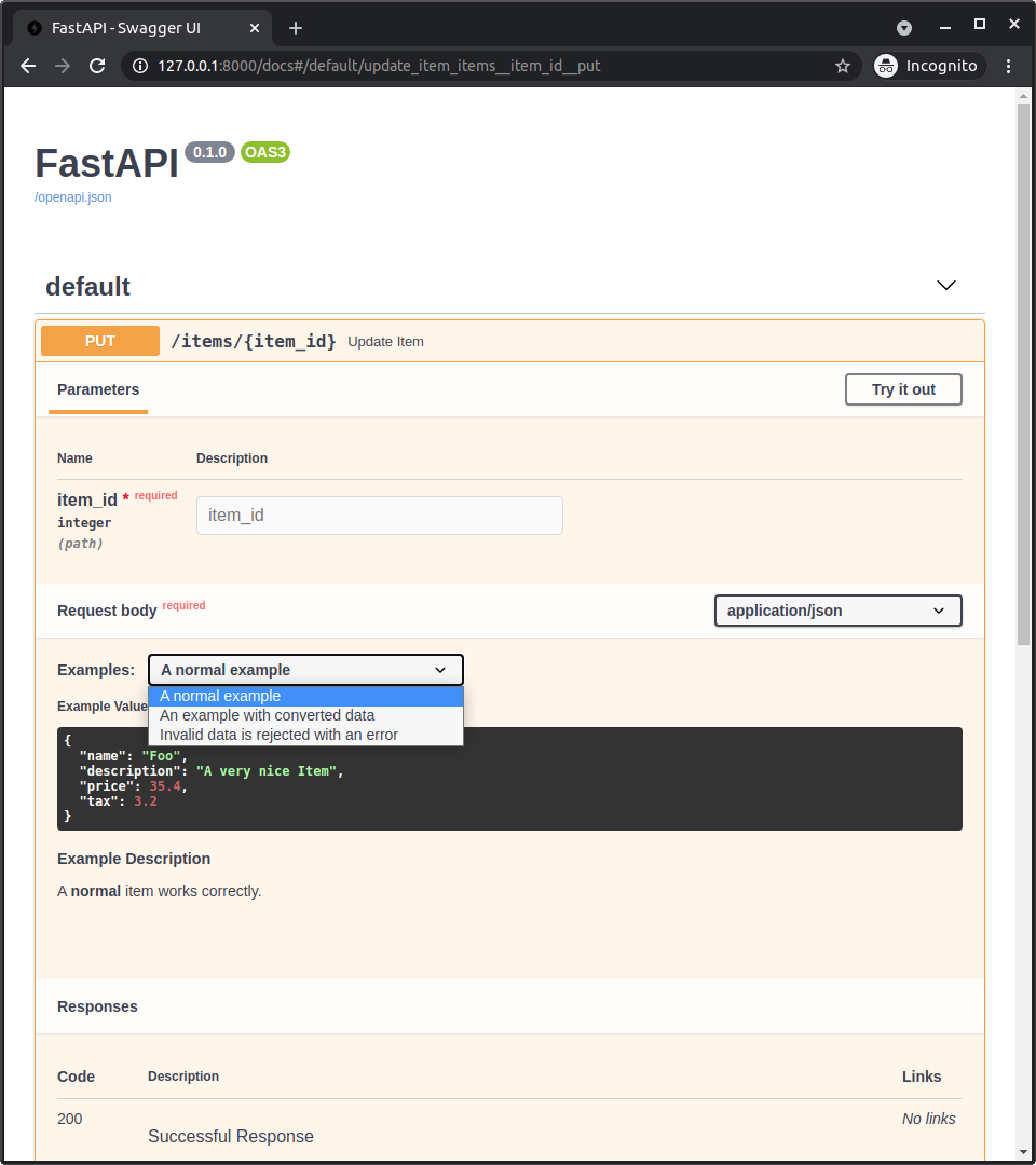To solve that, FastAPI 0.103.0 added support for declaring the same old OpenAPI-specific examples field with the new parameter openapi_examples. 🤓
